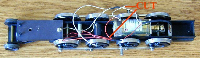 Solder the red wire on the decoder and an extra piece of red wire to the extra red lead on the wire assembly that goes to the power pickups on the left side of the chassis. Solder the black wire on the decoder and an extra piece of black or white wire to the extra white lead attached to the power pickups on the right side of the chassis. The extra pieces of wire provide a new set of leads for the smoke generator. Fasten the orange decoder wire to the red motor lead and the gray decoder wire to the white motor lead, but do not solder them yet. Put your the chassis on your track and test it to make sure it goes forward and backward on the right settings. If not, reverse these two wires. When you are sure everything is correct, solder the decoder wires to the motor leads. Your motor is now under control of the decoder.