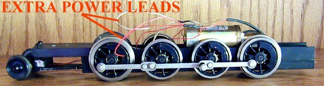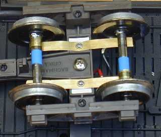 I found the power pickup on the Big Haulers to be a bit unreliable. We also have one of Bachmann's new 4-4-0s, and its power pickup through the drivers and the eight wheels on the tender is outstanding. I decided to modify the front truck on the Big Hauler tender so that it also picks up power. George Schreyer used LGB spring-loaded contacts for this, but here's a way to do it using a little brass, styrene, and shrink tubing. I used the trucks that came with the tender and replaced the plastic wheels with a pair of Bachmann metal replacement wheels, but another brand could probably be used just as well. Begin by cutting some scrap styrene to fill the openings in the cross piece of the Bachmann truck. This is clearly visible in the photo as the white area under the brass strips. I was using scrap and I'm not sure of the dimensions, but I think I used two pieces from an .050 styrene sheet for each opening. Cut the pieces large enough so they require pressure to fit them in the openings, then glue them in with CA. Next, modify the wheels. Both wheels are electrically isolated from the axel by a plastic bushing. One of the wheel/bushing assemblies moves on the axel to allow adjustment of the gauge. The wheels are coated with a dark material to make them less shiny. Chuck each end of each axel in a power drill and use a file to remove this coating from the rims of the wheels to insure good power pickup. If your drill chuck will not close down tight enough for this, you may need to get a micro-chuck. The last time I bought a power drill, I picked a model with this particularly in mind and got one with a chuck that will close down on a needle. Remove one wheel and set it aside. A bit of solder bridges the plastic bushing, connecting the remaining wheel to the axel. You can see this on the upper right wheel in the photo. Use a continuity tester to make sure current will pass between the wheel and the axel. If you solder the other wheel directly to the axel, you will just short your track when you place the wheels on the rails. The solution is a piece of shrink tubing and a piece of brass tubing. The shrink tubing I used is the largest size that comes in an bag of assorted sizes sold at Radio Shack. The blue tubing and it is clearly visible in the photo. Of course, part of the shrink tubing is under the brass tubing; it goes flush against the plastic bushing in the wheel. It's just the right size to fit over the axel. Cut a piece a bit less than half the length of the axel between the wheels, slip it over the axel, and shrink it with a hair dryer. Next, take a piece of 9/32 brass tubing, cut a long slot in the side with a Dremel tool using a fine cutoff wheel, and cut two short lengths off the slotted part of the tubing. (I had to split the tubing because the 9/32 brass tubing was too tight to fit over the shrink tubing. A piece of 5/16 brass tubing might fit, but the local shop was out and I was afraid it might be too loose anyway.) Pry the pieces of brass tubing open along the cut and slide them over the shrink tubing on the axel. Replace the other wheel, adjust the gauge of the wheel set, slide both shrink and brass tubing to that end of the axel, and tighten the brass tubing around the shrink tubing with pliers. Solder this second wheel to the brass tubing and check for continuity between the wheel and the brass tubing. The wheel sets are done. The axel and the brass tubing are electrically isolated by the shrink tubing. One wheel on each axel set is connected to the axel and the other is connected to the brass tubing. Do a continuity check to make sure that current can not pass from wheel to wheel. I installed the axels with the brass tubing on opposite sides of the train to balance the overall weight of the truck. Construct and install a set of wipers from brass. Drill and tap holes for 2-56 screws through the brass wipers and the styrene inserts in the trucks. Then attach the wipers to the trucks with 1/4" 2-56 screws. The wipers ride above the axels to reduce the chance that they might catch on small debris on the rails. Solder two wires to the tops of the wipers, drill a hole in the bottom of the tender, and pass the wires through. I used 22 gauge red and black wires that can be seen in the photo. All that's left is to run a set of wires between engine and tender to connect the power pickups. Details on how are did that are in the section below on installing a sound-only decoder. The improvement in the performance of the Big Hauler with the power-pickup in the tender is remarkable. I planned to modify both tender trucks, but the improvement was so great with one truck modified that I haven't felt compelled to modify the other yet. Installing a SoundTraxx DSX sound-only decoderI replaced the original sound system with a SoundTraxx DSX sound-only decoder for a K-36. I put the decoder in the tender following the very clear instructions that came with the decoder and using the speaker that came with the Big Hauler. I filled stray openings in the bottom of the tender with silicone cement to make the sound chamber as tight as possible. I removed the wires and switch for the original Bachmann sound system from both the engine and the tender using the opening left by removal of the wiring for the original sound system. Then I installed a three-wire cable with a mini-connector between the engine and tender. One the engine, the first wire goes to the right-hand pickup, the middle wire goes to the left-hand pickup, and the third wire goes to the chuff switch. One the tender, the first wire goes to the right-hand pickup (see section above on adding power pickup to the tender, and to one of the power leads on the decoder, the middle wire goes to the left-hand pickup and the other decoder power lead, and the third wire goes to the brown lead on the decoder. Experiences with Barry's Big Trains 4-6-0 drive for the Big HaulerWhile pulling half a dozen cars up a grade of about 4%, my Bachmann 4-6-0 stoppe