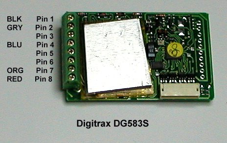 | We use Digitrax decoders in all our locomotives and have had very good success with them. But Digitrax has come out with a new 5-amp decoder, the DG583S, since the last time I bought decoders. This decoder is very different from the earlier large scale decoders from Digitrax. Their earlier decoders were smaller, shrink-wrapped in white plastic, and had four wires in place of the pins shown in the diagram to the left. The socket for the 9-pin wiring harness is still there. Digitrax provides the wired harness, but it does not provide wires to connect to the pins. |